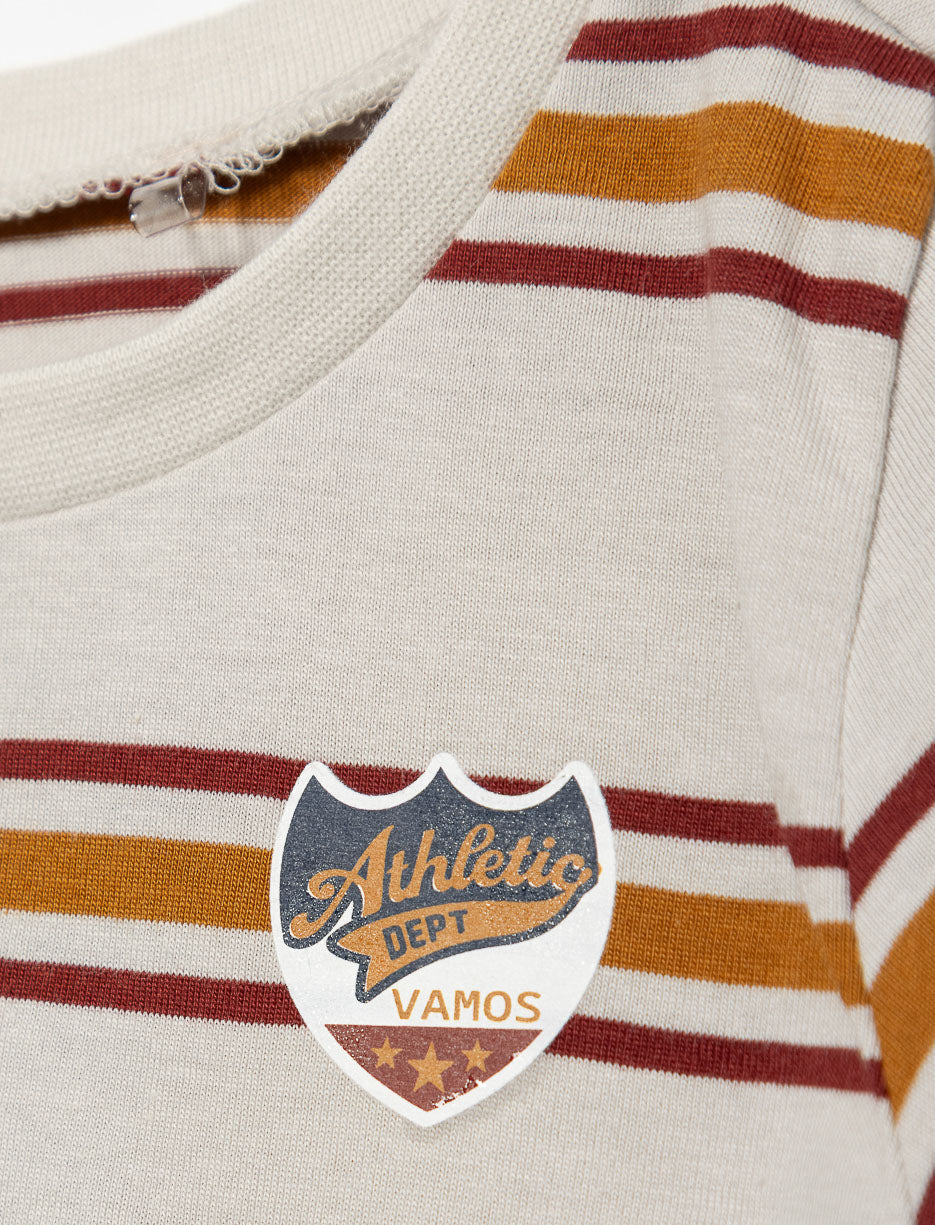 Enveloppez votre petit dans la douceur avec ce t-shirt rayé à écusson imprimé. Confortable et facile à porter, il assure liberté de mouvement et style au quotidien, tout en ajoutant une touche colorée et charmante à ses ensembles.