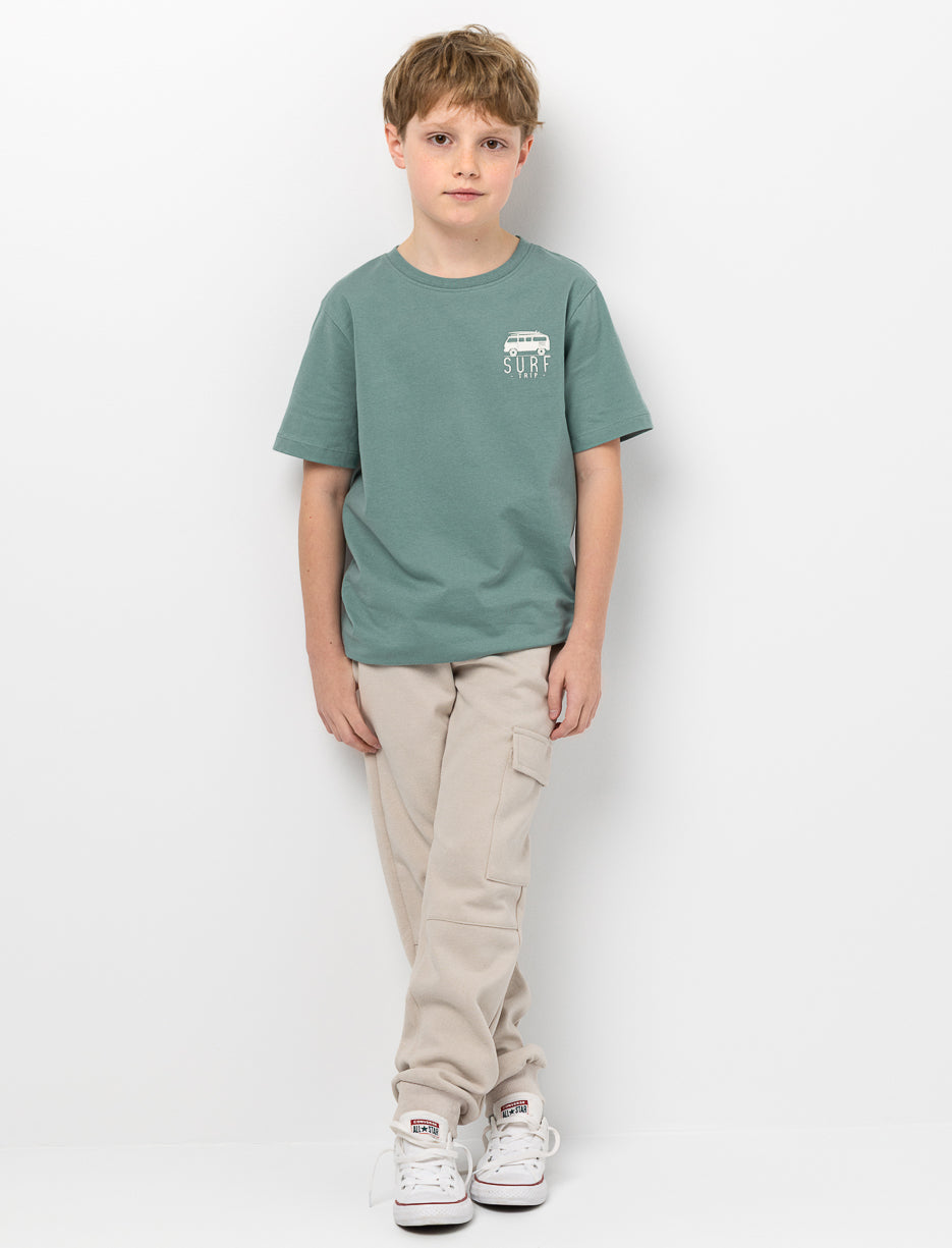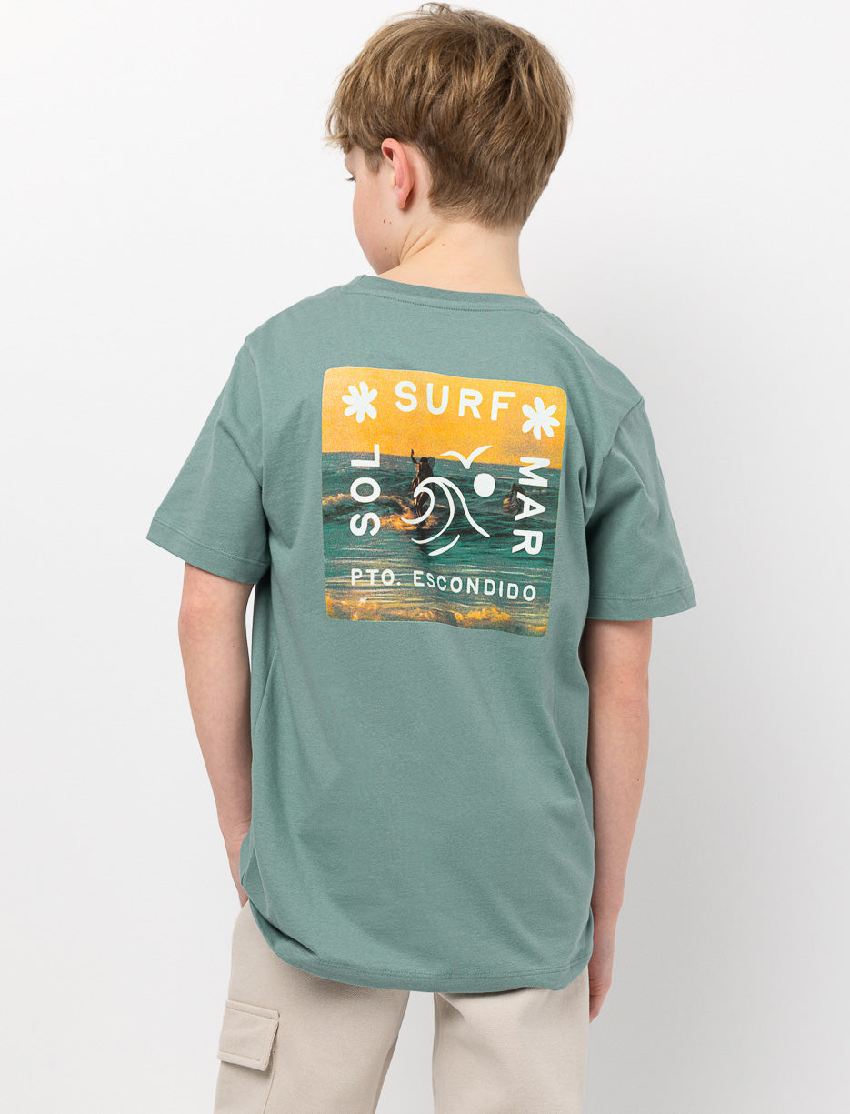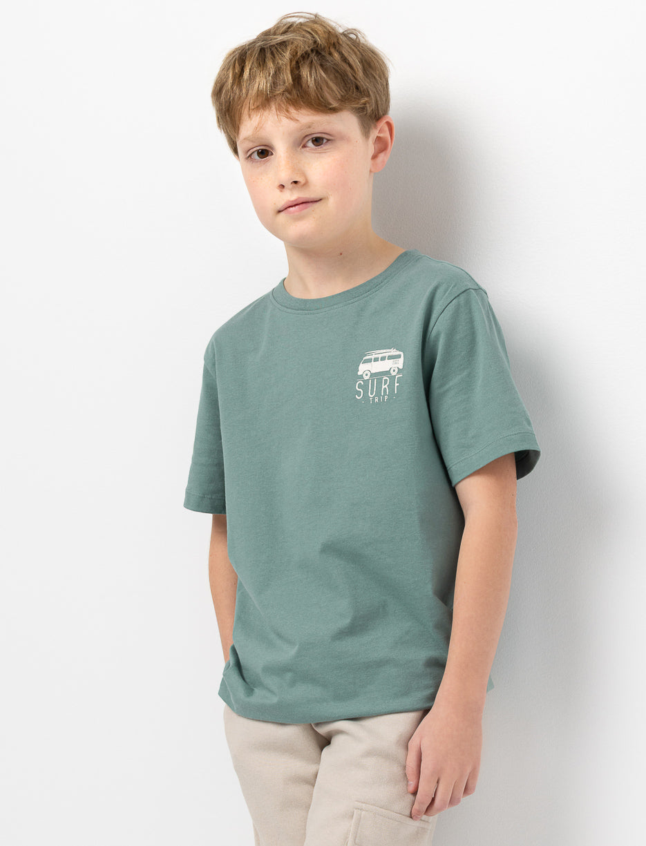 Un t-shirt en coton bio avec imprimé au dos qui évoque l’esprit surf. Léger et confortable, il apporte une note décontractée au quotidien et s’intègre facilement aux looks simples et actuels des plus jeunes.