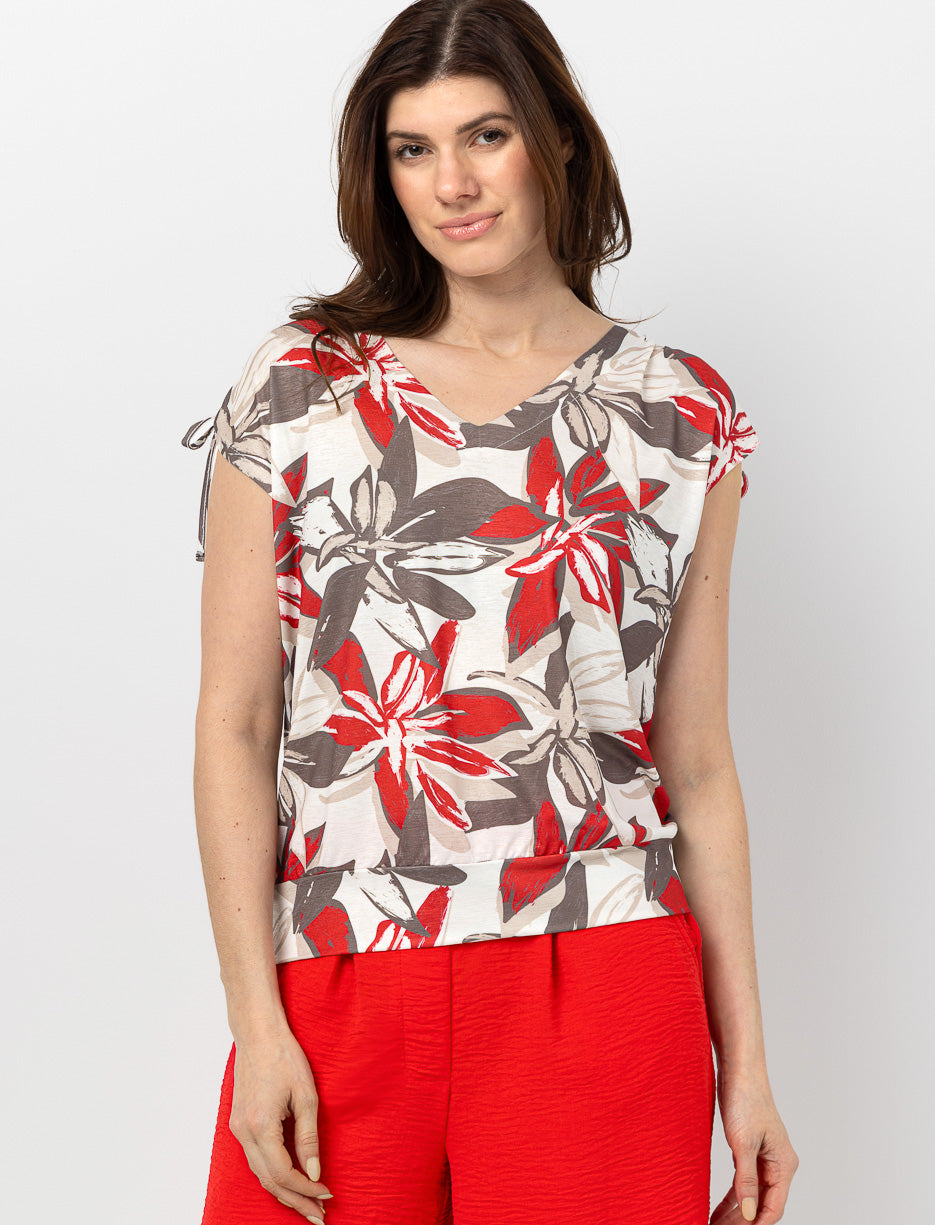 T-shirt sans manches pour femme avec col en V élégant et motif floral captivant. Les cordons de serrage aux épaules permettent un ajustement sur mesure pour une silhouette flatteuse. Polyvalent et tendance, c'est la pièce essentielle de votre garde-robe.